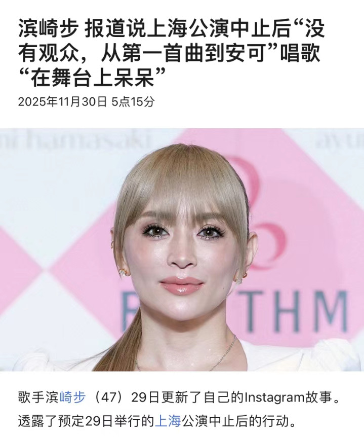 知名歌手滨崎步原定周末的上海演唱会,在一天前也接到必须取消的通知。